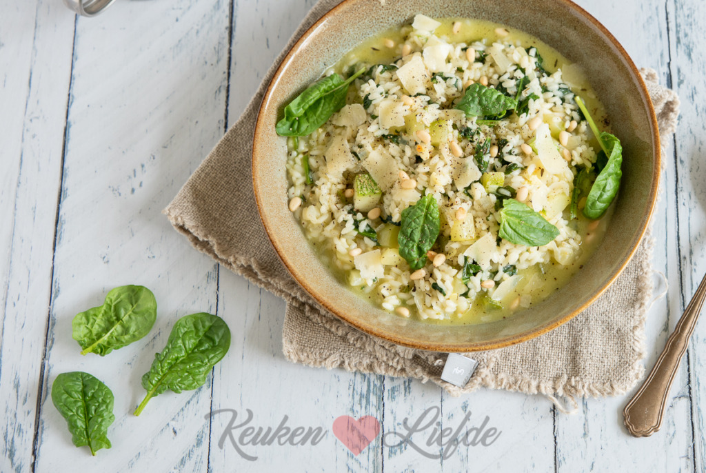 Een makkelijk eenpansgerecht op tafel zetten? Risotto it is! Deze risotto met courgette, spinazie en pesto is vegetarisch en heel makkelijk om te maken. Voeg je graag vlees of vis toe? Zie dan onderstaande variatietip!