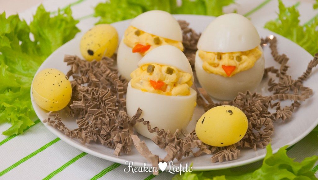 Naast de ‘gewone’ gevulde eieren mogen ook deze gevulde paaseieren niet ontbreken bij het paasontbijt. Ella-Marie vindt ze geweldig omdat het lijkt alsof er uit de eieren kuikentjes komen – maar papa en mama zijn er ook dol op!