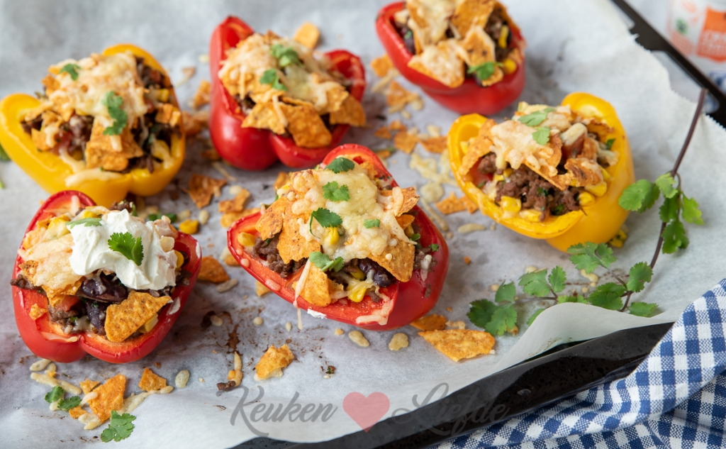 Verwarm de Airfryer voor op 180 graden. Dek de gevulde paprika’s (je hoeft de paprika’s niet voor te garen) af met alufolie en bak 12 tot 15 minuten in het mandje van de Airfryer. Verwijder het alufolie en verlaag de temperatuur naar 160 graden. Strooi de nacho’s en kaas eroverheen en bak nog 5 tot 8 minuten verder.