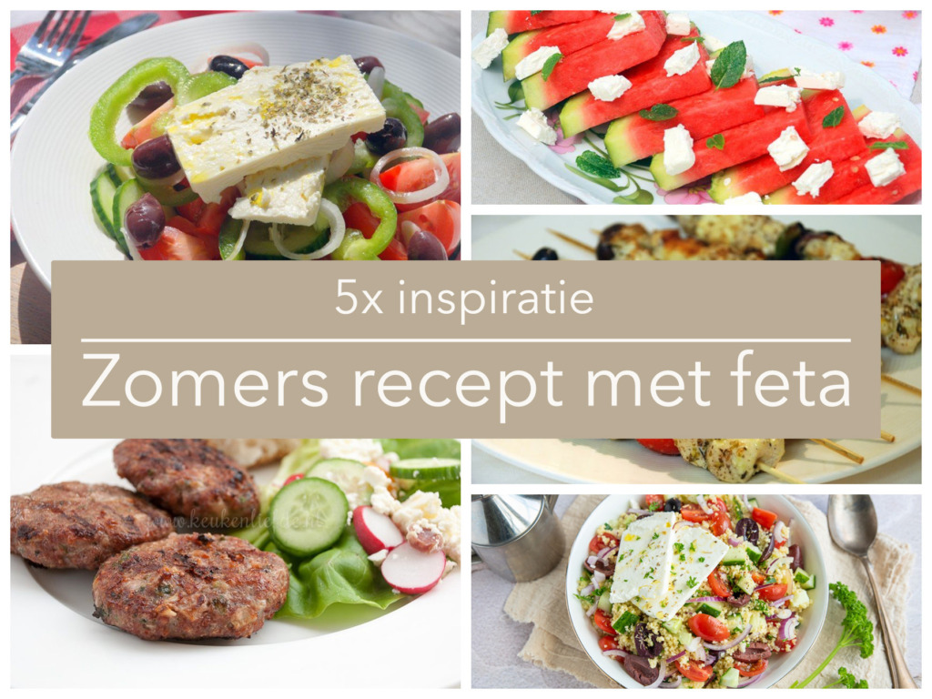 Bij ons in de koelkast ligt bijna altijd een stukje feta. Zeker in de zomer. Feta smaakt goed bij heel veel gerechten. Je denkt natuurlijk als snel aan een salade, maar feta is heel veelzijdig. Zo kun je hem als smaakmaker verwerken in bijvoorbeeld een hamburger (zie de bifteki hieronder), of aan een spies rijgen met kip (zie de Griekse kipspiezen hieronder). Hieronder heb ik 5 keer een heerlijk zomers recept met feta voor je op een rij gezet. Welk gerecht je ook kiest, feta maakt het smulfeest compleet.