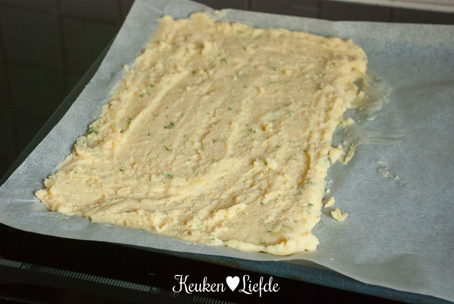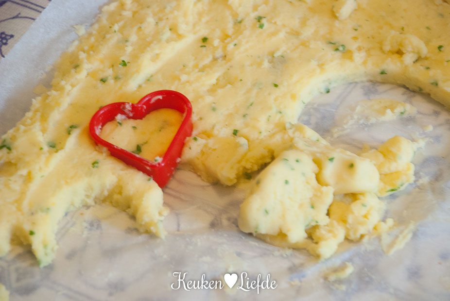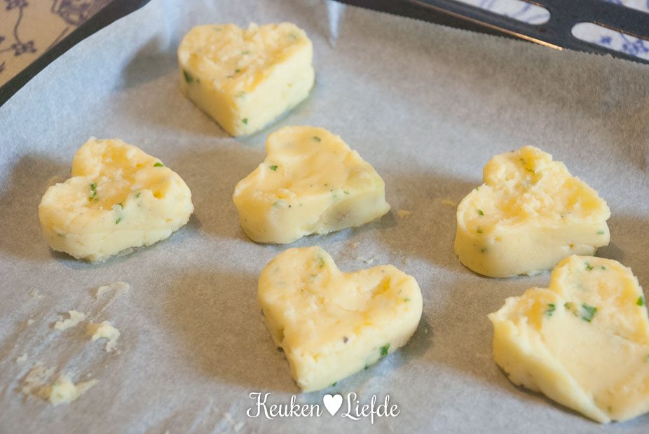 Bereid de pommes duchesse volgens deze bereiding. Spreid de aardappelpuree uit over een, met bakpapier bekleed, bakblik (een rechthoekige bakvorm kan ook) en steek met de hartjesvorm hartjes uit. Leg de aardappelhartjes op een ander, met bakpapier bekleed, bakblik en ga zo verder, totdat je de gewenste hoeveelheid hartjes hebt. Het is even een gepriegel, maar het eindresultaat is het meer dan waard.