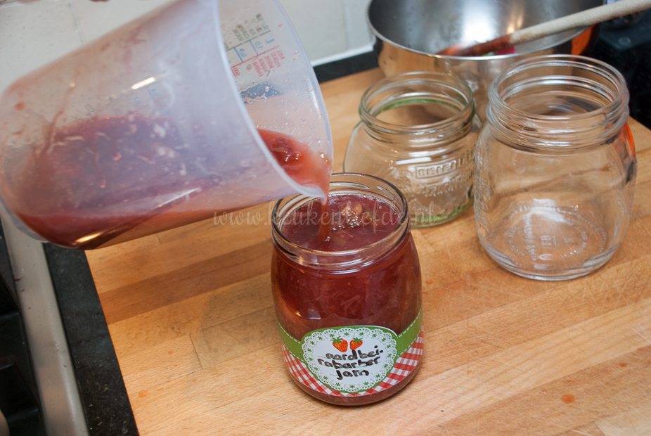 Was de rabarberstengels en verwijder de harde, uitgedroogde uiteinden. Snijd de rabarberstengels in niet te grote stukken. Was de aardbeien en verwijder de kroontjes. Snijd grote exemplaren een keer doormidden. Doe de rabarber en aardbeien samen met de geleisuiker in een ruime kookpan. Verhit al roerend op middelhoog vuur. Kook net zolang totdat het fruit zacht is en de rabarber uit elkaar valt. Schenk de jampotten tot de rand met jam en draai de deksel dicht.