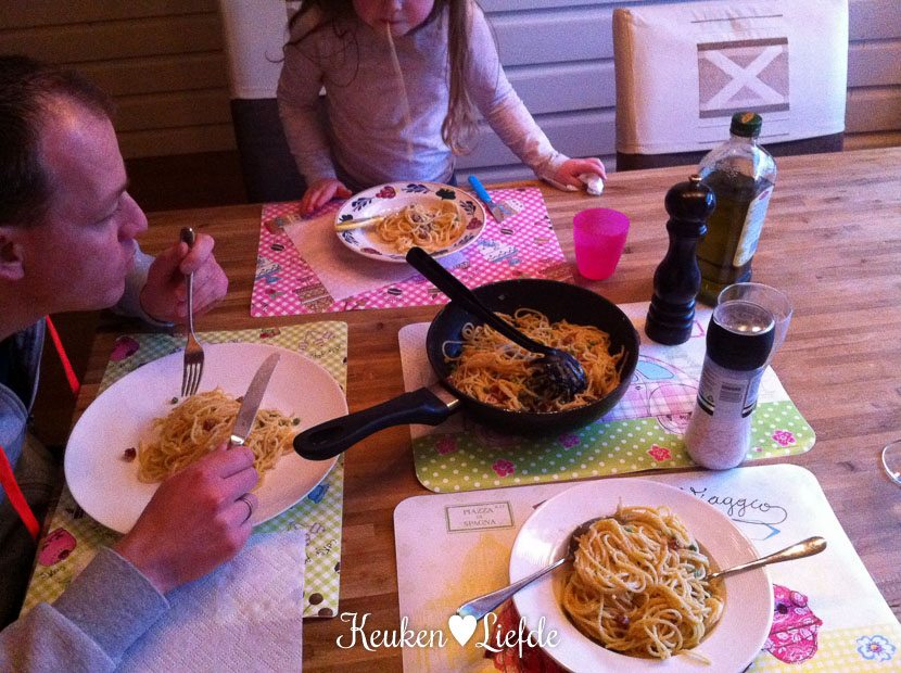 Eenmaal binnen, moet ik bedenken wat we gaan eten. Ik had niets voorbereid en weinig in huis, maar gelukkig heb je maar weinig ingrediënten nodig voor lekkere spaghetti carbonara! Dit keer maakte ik hem met chorizo in plaats van spek en doperwten. Mmmmm … Heerlijk! Recept komt binnenkort online.