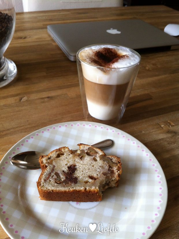 Ik begin de ochtend met een latte macchiato en een stuk bananenbrood. Genieten! Aangezien El uit logeren is, ziet Johan zijn kans waar en slaapt lekker uit.
