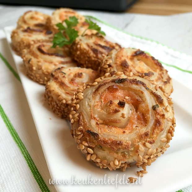 Ik maak ’s ochtends deze bladerdeegrolletjes met Boursin, gerookte zalm en sesamzaad. Ze zijn zo lekker dat ik ze bijna allemaal opeet. Als ontbijt.