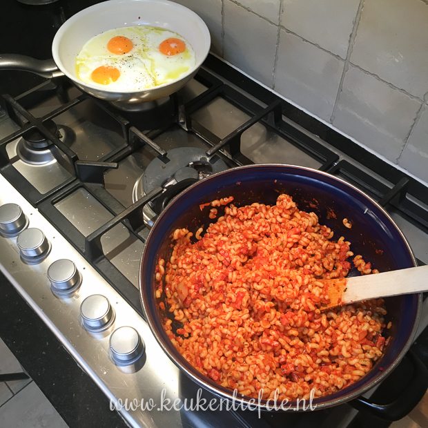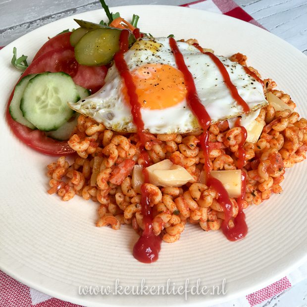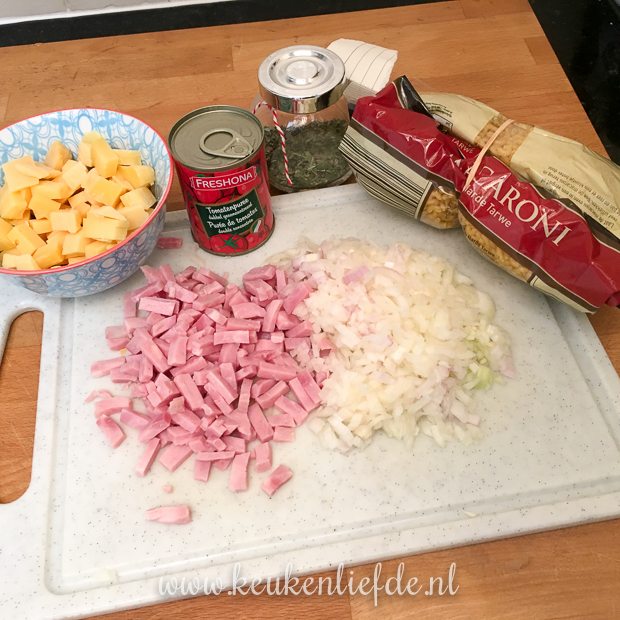 Ik heb nog gekookte macaroni en bolognesesaus over van gisteren en besluit ze te gebruiken voor twee verschillende gerechten. Met de bolognesaus maak ik aardappellasagne met bechamelsaus. De gekookte macaroni gebruik ik voor een nieuw macaronigerecht die eigenlijk al heel oud is. Macaroni zoals je hem vroeger at. Uitje en hamblokjes (Vroeger was Smac favoriet, maar ik gebruik hamblokjes omdat ik die nog had liggen) bakken, tomatenpuree erbij, macaroni koken (ik hoefde de macaroni alleen maar op te warmen) en mengen met de saus. Ik voeg ook nog kaasblokjes toe. Serveren met augurk, ketchup, gebakken ei, sambal en eventueel een drupje Maggie voor de liefhebber. Lekker jóh!