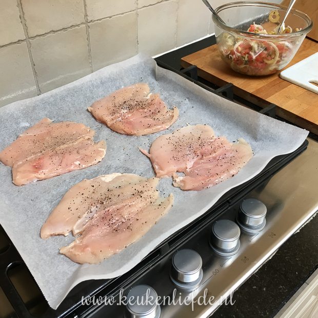 Na al het overdadige eten (lees: veel chocoladepaaseitjes) tijdens de paasdagen heb ik zin in gezond en licht avondeten. We eten chicken paillard (gevlinderde kip) met venkeltopping: opengesneden kipfilet, belegd met een mengsel van venkel, tomaat, olijf, kappertjes, sjalot, geroosterde pijnboompitjes en rozijntjes. Daarna gaat het kort de oven in. Het is één van de allereerste recepten die ik deelde op KeukenLiefde en nog steeds mijn favoriet. Zo ontzettend smaakvol. Hier mag je me ’s nachts voor wakker maken!