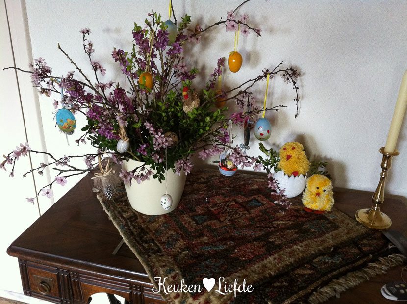 Van mijn moeder had ik ‘paastakken’ meegekregen en ik moest haar beloven een foto door te sturen zodra ze in huis stonden. Ik heb niet zulke groene vingers als mijn moeder, maar het ziet er toch leuk uit.