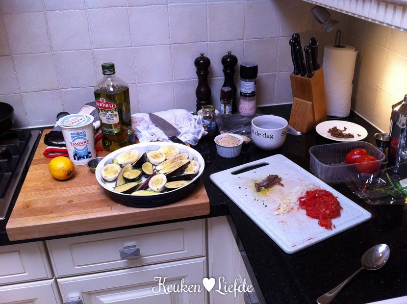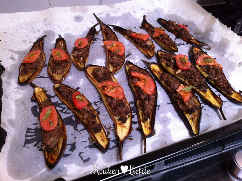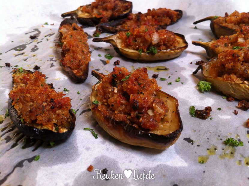 Daarna duik ik direct de keuken in en ga aan de slag met de berg mini-aubergines. Ik maak twee bereidingen van gevulde aubergines. Eén met pittig gehakt en frisse yoghurtsaus en de andere met broodkruim, tomaat en ansjovis. Beide varianten smaken verrukkelijk en ga ik snel met je delen.