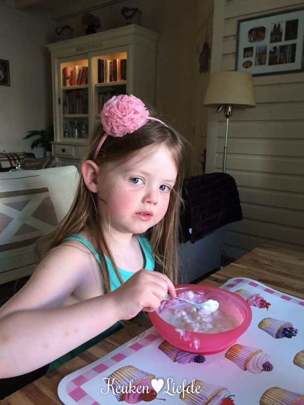 De rest van de dag doen we niet veel bijzonders. Ik heb ’s avonds geen zin (nog steeds moe en lui) om uitgebreid te koken, dus maak ik een grote pan spaghetti carbonara. Dat smaakt altijd. Omdat Ella-Marie goed heeft gegeten maakt papa een lekker toetje voor haar klaar. Volgens Ella is papa de allerbeste toetjesmaker van de hele wereld en ik sluit me daarbij aan.