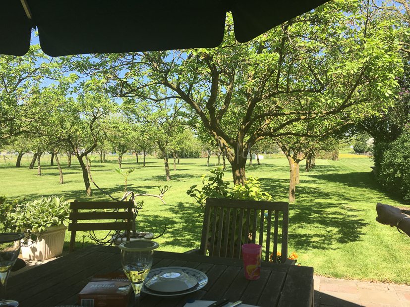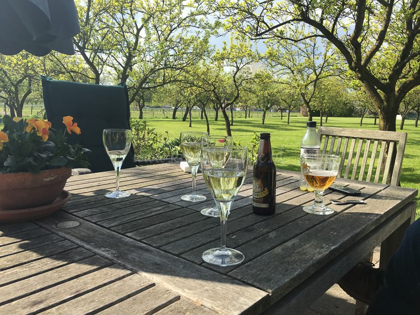Vandaag eten we bij mijn ouders. Maar voordat we binnen aan tafel gaan, drinken we buiten in de zon een aperitief.
