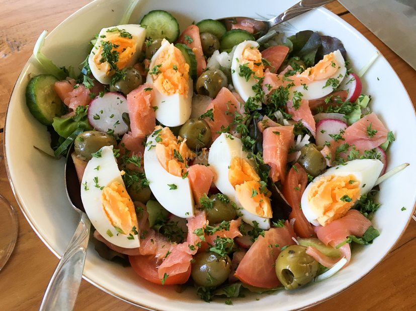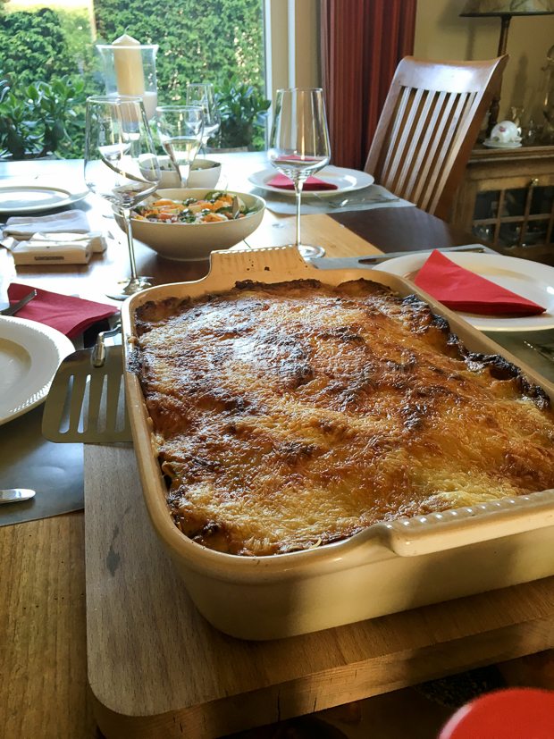 Mijn moeder heeft een ovenschotel gemaakt met krieltjes, gehakt, bechamelsaus en heeeeeel veel groenten en een salade met gerookte zalm. Lekker? Alle schalen ging schoon leeg!