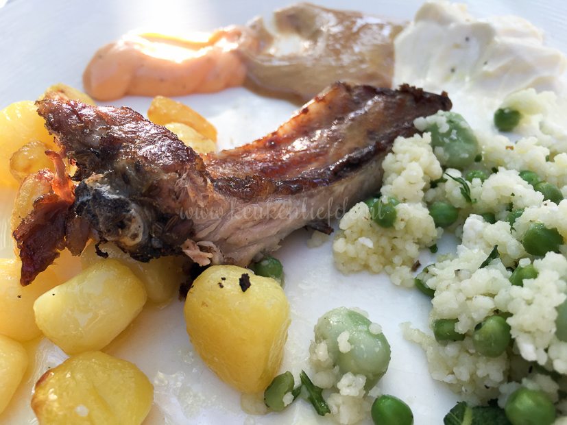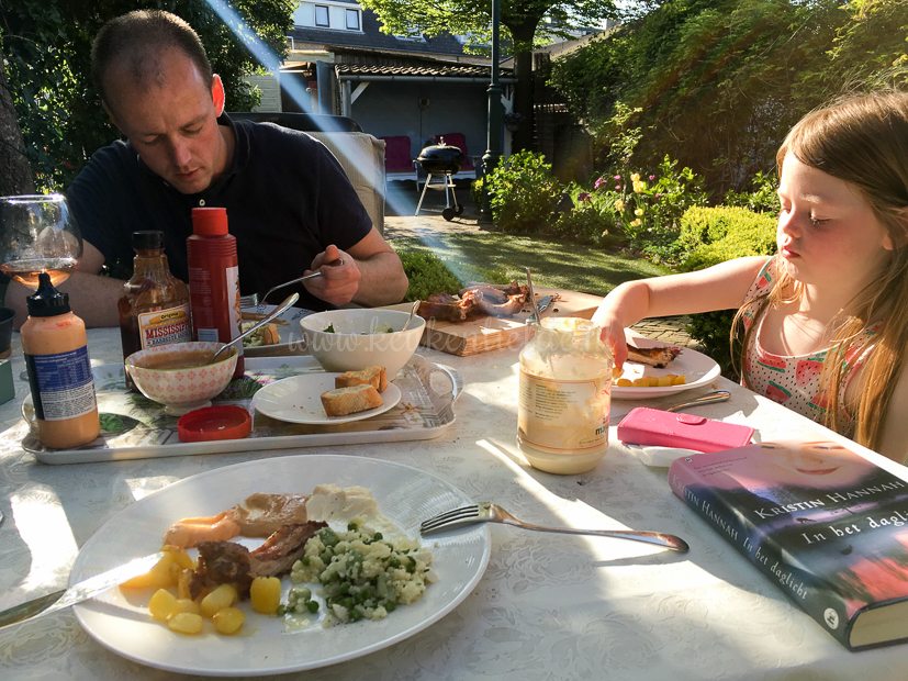 ’s Avonds steken we de barbecue aan en genieten onder andere van de zelf gemarineerde spareribs, kipsaté, gebakken krieltjes, sla en couscoussalade met tuinbonen, doperwten, munt en feta.