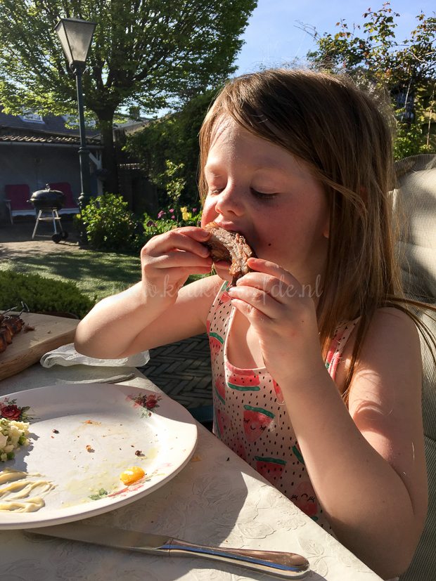 Als we ’s avonds thuis zijn, zet ik nog wat ribs in een kruidenrub en laat ze een nacht marineren in de koelkast.