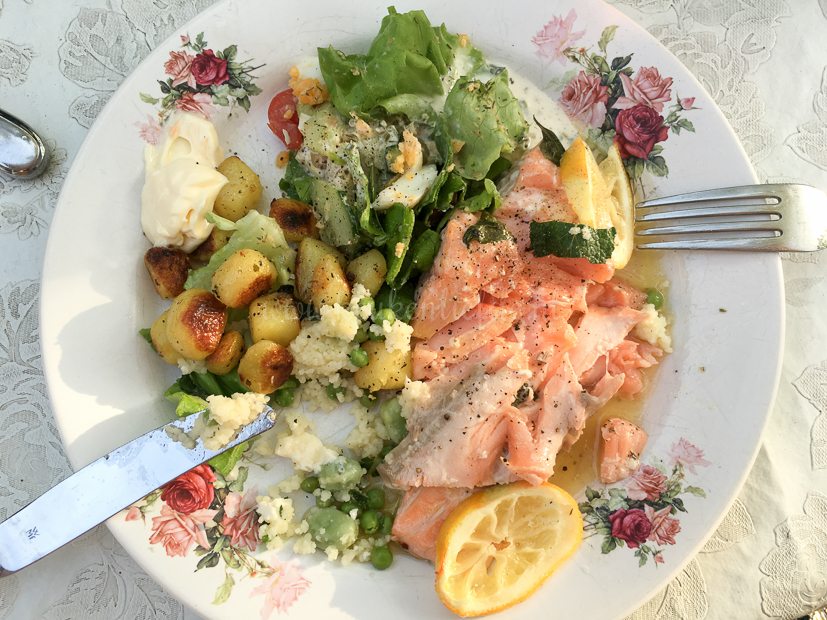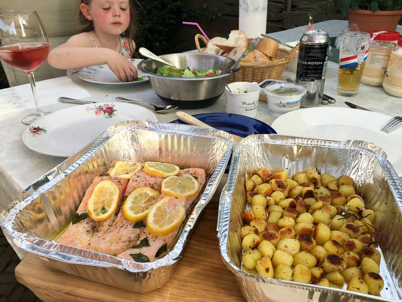 ’s Avonds steken we voor de tweede keer op rij de barbecue aan. Dit keer genieten we van zalm, krieltjes, stokbrood en salade.
