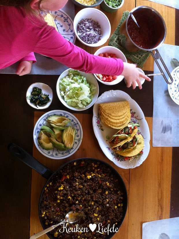 Na de zwemles rijden we weer naar mijn ouders, waar ik aan de slag ga met een nieuwe Mieks Special. Ik maak Mexicaanse taco’s! Het recept kwam afgelopen zaterdag online en is een dikke vette aanrader.