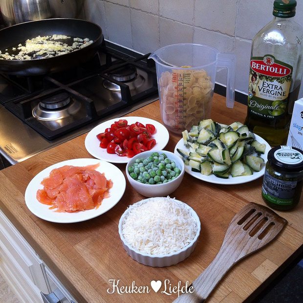 Eenmaal thuis ga ik aan de slag met een heerlijk pastagerecht: pasta pesto met courgette en zalm. Verrukkelijk! Het recept deel ik binnenkort.
