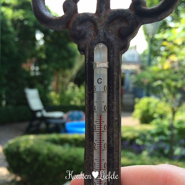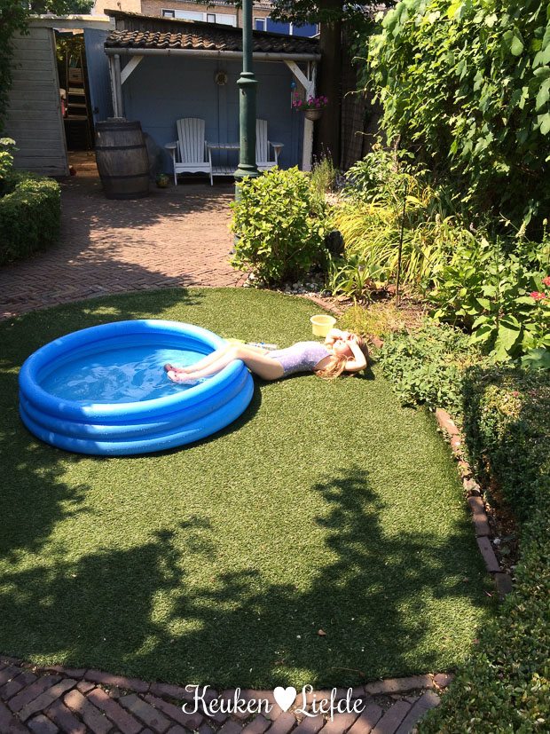 Woah, de thermometer tikt bijna 40 graden aan! Zelfs het water in het zwembadje is lauw.