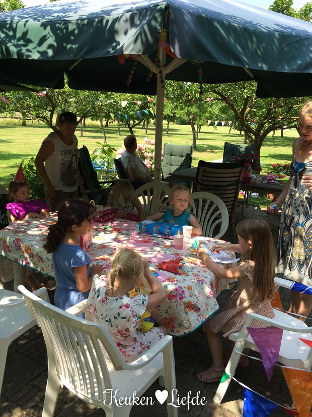 Ella-Marie viert vandaag haar allereerste kinderfeestje. Ze kijkt er al weken naar uit en eindelijk is het zover. We vieren het feestje onder de verkoelende pruimenbladeren in de boomgaard van mijn ouders.