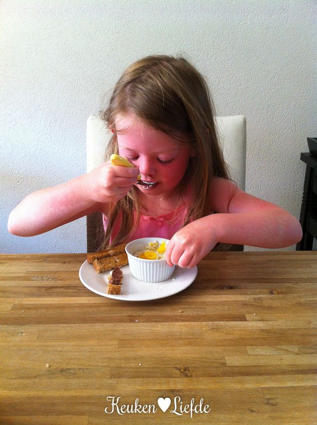 Als ik aan El vraag wat ze voor ontbijt wil, is het antwoord: ‘eierbakjes met soldaatjes‘. Die lust mama ook wel. Niet veel later zitten we heerlijk te smikkelen. Ik voel een grote opluchting dat ze eindelijk na dagen weer wat eten binnenkrijgt.