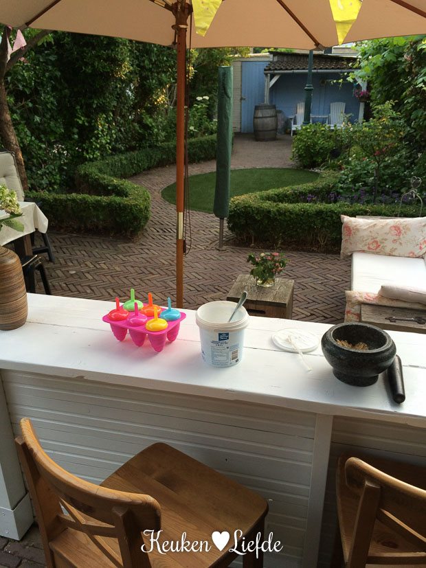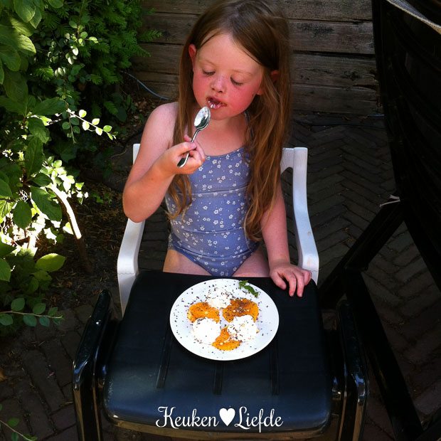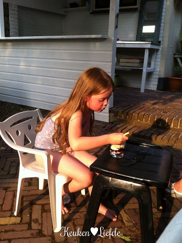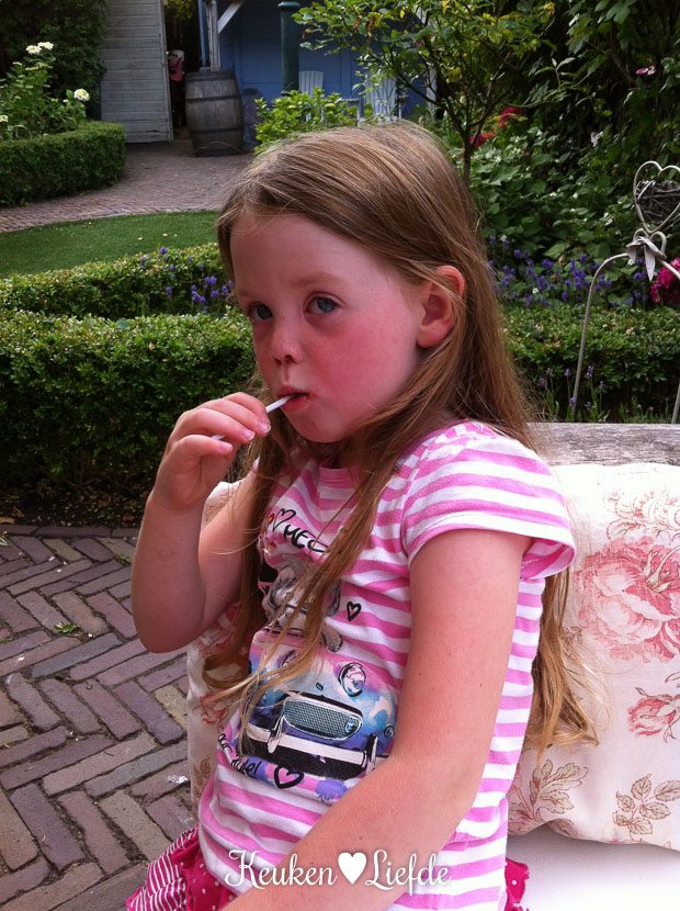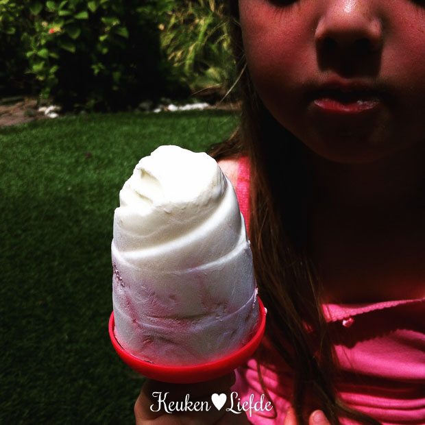 El ziet ’s middags de zelfgemaakte yoghurtijsjes in de vriezer staan en staat direct te springen om er één te proeven. Op mijn vraag of ze lekker smaken, krijg ik een bevestigende ‘Huh huh’ en ‘Mmmmm’.