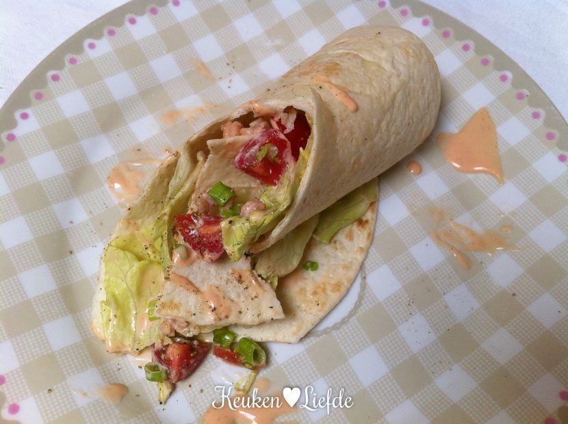 Voor de lunch maak ik een lekkere wrap met wat ijsbergsla, Hollandse garnalen, tomaat, lente-ui en zelfgemaakte cocktailsaus. De foto is niet erg elegant, maar lekker was -ie wel!