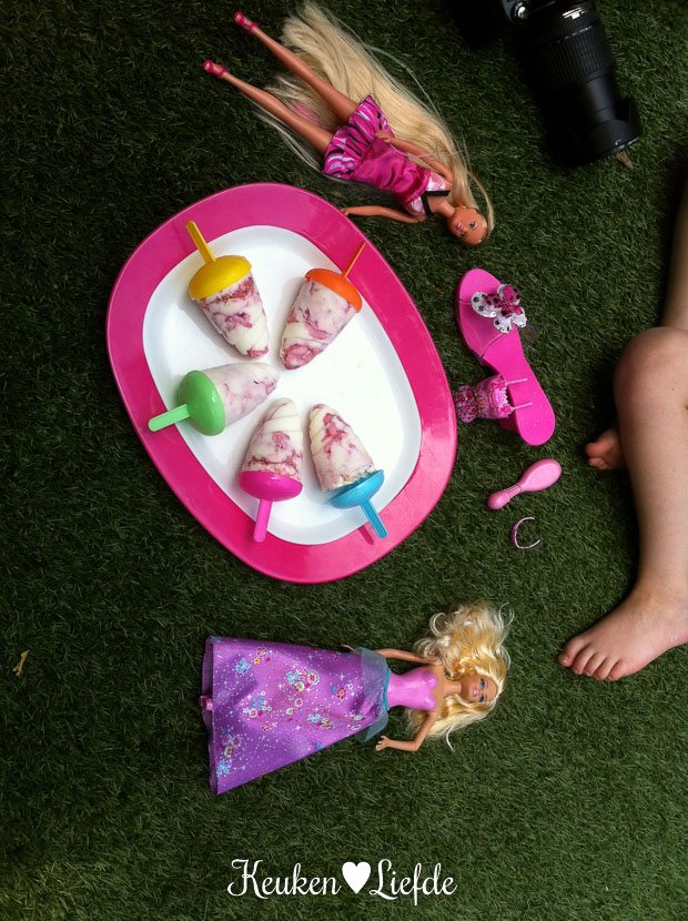 Om een uur of negen ’s avonds krijg ik ineens een ingeving voor een nieuw Speels & Smakelijk recept. Ik vul ijslollyvormpjes met zelfgemaakte hangop en roer er een swirl doorheen van grenadinesiroop en verkruimelde koekjes. Nu maar afwachten of deze frozen-yoghurtijsjes wel de goedkeuring van Ella-Marie kunnen wegdragen. Ze is meedogenloos weet je.