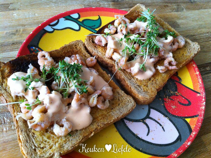 Johan luncht met geroosterd brood en Hollandse garnalen. Mmmm, lekker hoor!