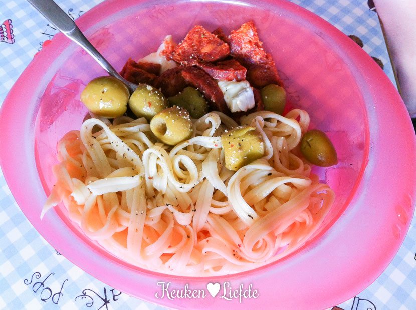 Ik maak tevens wat verse linguine voor Ella-Marie omdat ze pompoenvulling te pittig vindt. Ik had er maar een half pepertje doorgedaan, maar een beetje pit in het eten kan haar nog niet bekoren. Het bordje linguine van El.