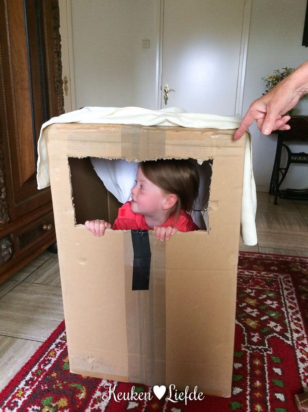 De provisorisch in elkaar geknutselde poppenkast bij mijn ouders. Voordat Johan en ik Ella-Marie weer mee naar huis nemen, moet er een voorstelling worden gegeven. Haha!