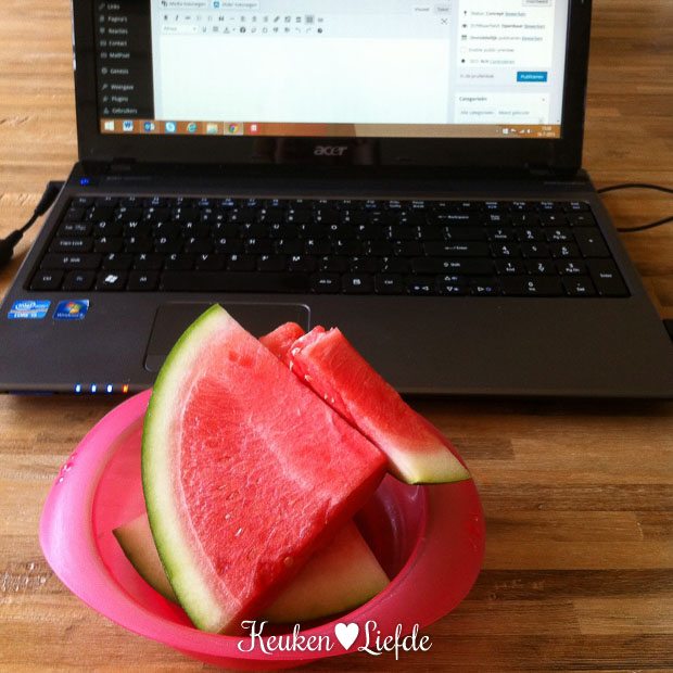Johan brengt Ella-Marie naar zijn moeder, voordat hij naar zijn werk gaat en ik duik weer achter de computer. Als ik tussen de middag met een stuk watermeloen achter de computer zit te werken, stuurt Johan me foto’s van zijn lunch door. Tja, verschil moet er zijn. 🙂