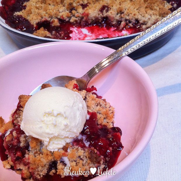 Ik maak ondertussen een roodfruitcrumble — die ik eigenwijs verrijk met Bastognekoekjes. Een heerlijk dessert om aan gasten te serveren. Je maakt hem klaar in een handomdraai. Ik vind hem warm uit de oven het allerlekkerst met een bol vanille-roomijs. ‘Poepielekker!’, zoals mijn moeder zou zeggen. Het recept komt eraan.
