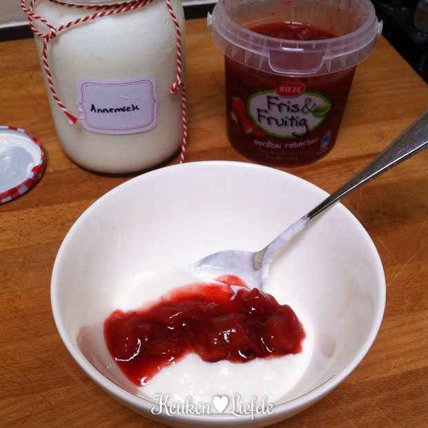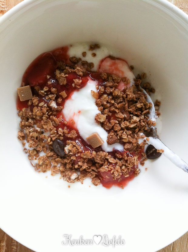 Ik heb vandaag de volledige dag om te werken. Ik ontbijt met een bakje yoghurt, een lepeltje Fris & Fruitig en wat cruesli achter de computer. Prima ontbijtje.