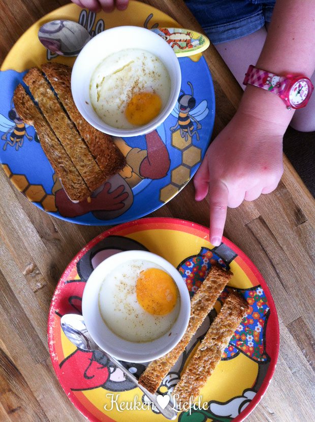 Ella-Marie en ik ontbijten met onze favoriet: oeuf en cocotte met soldaatjes!