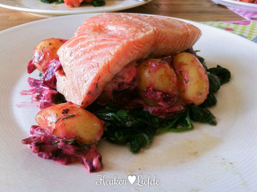 Omdat ik nog bietjes overhad van de burger van gisteren besluit ik er wat ingrediënten bij te verzinnen voor het avondeten. Ik maak een aardappel-bietensalade die ik serveer met kort gebakken wasabizalm en gebakken spinazie. Lekker, maar niet bijzonder genoeg om het recept ervan met je te delen.