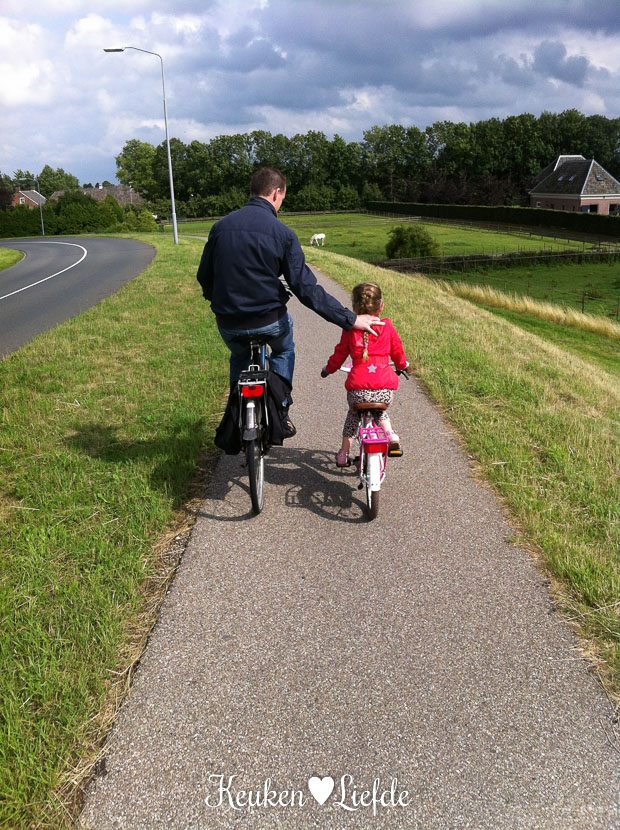 Gelukkig klaart het ’s middags op. We besluiten naar Johan zijn ouders te fietsen. El mag op haar eigen fiets. Het gaat supergoed!