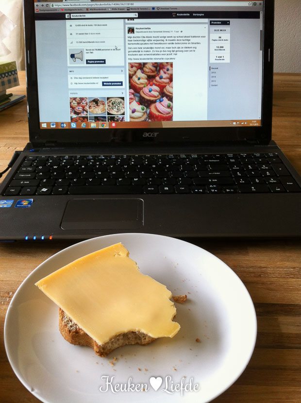 Tussen de middag neem ik een speltbeschuitje met oude kaas, ook achter de computer. Jummm!
