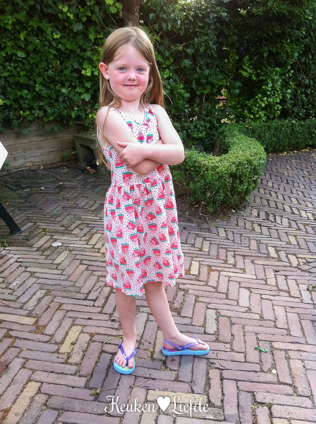 ’s Middags fietsen Johan, Ella-Marie en ik naar de stad. Bij de H&M kopen we onder andere dit schattige jurkje voor maar vijf euro. Strike a pose … We kochten hetzelfde jurkje ook met blauw-witte strepen.