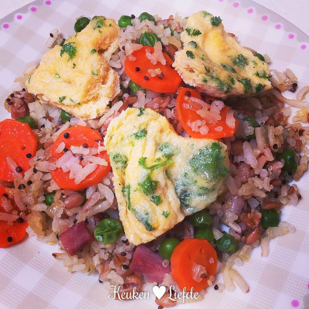 Ik ga aan de slag met een nieuw gerecht voor de kindercategorie Speels & Smakelijk. Ik maak eenvoudig gebakken rijst die ik liefdevol serveer met eihartjes. Dit gezonde gerecht — in plaats van witte rijst gebruik ik een pak Lassie Zilvervliesrijst + Spelt en quinoa — is echt supermakkelijk om te maken en een genot voor zowel jong als oud. Het recept ga ik binnenkort met je delen.