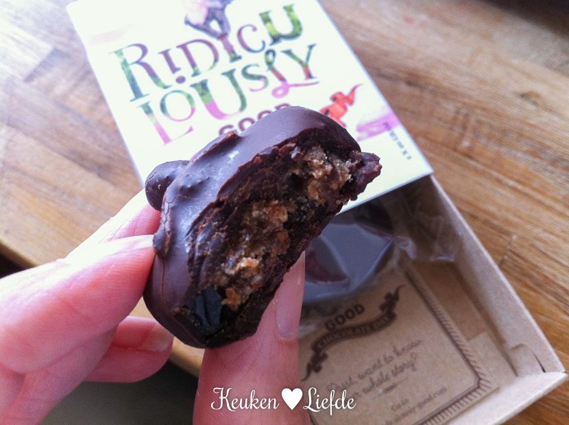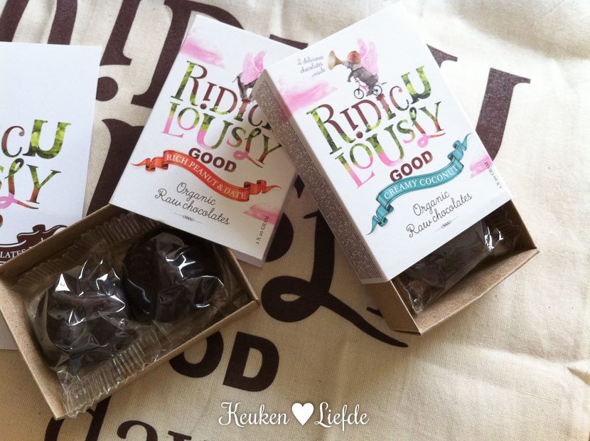 Ik krijg een goodiebag thuisbezorgd van Ridiculously Good. Deze schattige chocolaatjes zijn gemaakt van rauwe chocolade en verkrijgbaar in de smaken Rich Peanut & Date en Creamy Coconut. De vullingen zijn suikervrij en gemaakt van biologische en fair trade verkregen ingrediënten. De smaak is top! Hoewel ik eigenlijk helemaal niet zo van pure chocolade hou, vind ik deze rauwe chocolade echt heel erg lekker. De smaak is zacht, romig en heeft geen bittere smaak, zoals gewone pure chocolade vaak wel heeft. Ik ben echt fan! Bovendien zijn de chocolaatjes per twee stuks verpakt in schattige — soort van lucifer — doosjes. Superleuk om bijvoorbeeld iemand cadeau te geven.