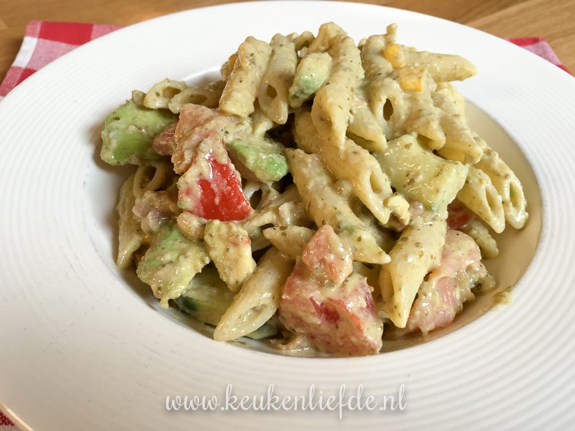 We smullen ’s avonds van een pastasalade met avocado, tomaat en gerookte zalm.