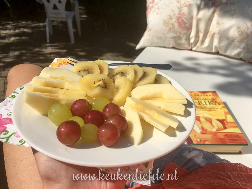 Ik lunch met een lekker fruitbakje in de tuin, in de zon.