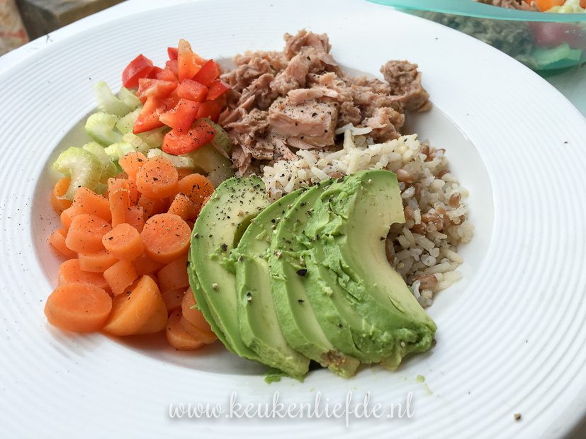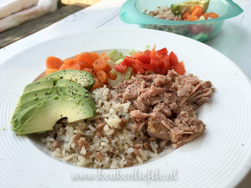 Het avondeten van mij en dochterlief bestaat uit gekookte zilvervliesrijst, quinoa en spelt met avocado, gekookte wortel, bleekselderij, paprika en tonijn. Ook een perfect gerecht om als lunch mee naar je werk te nemen.