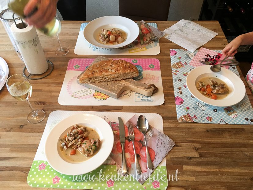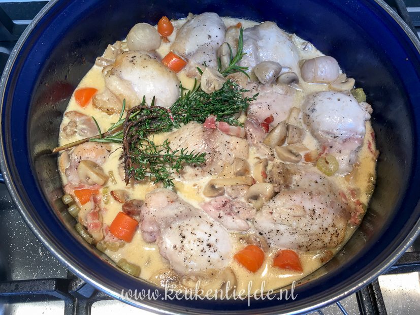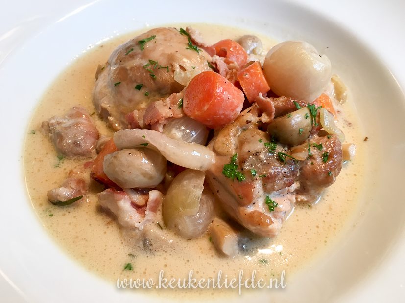 Voor het avondeten maak ik coq au vin, maar dan met witte wijn en room in plaats van rode wijn.