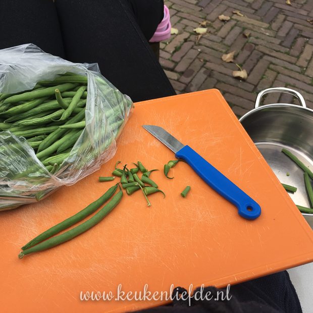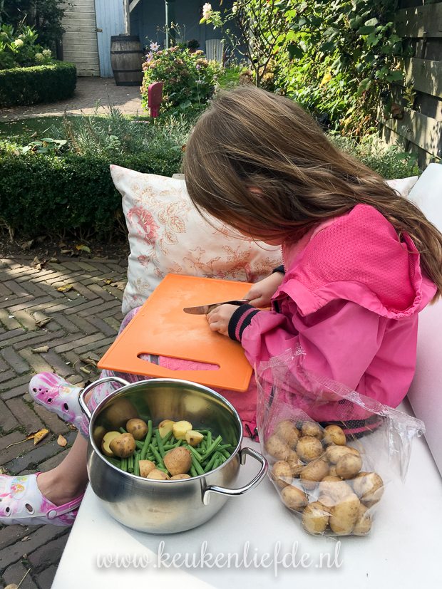 Ella-Marie is verkouden dus we houden ons vandaag een beetje rustig. El helpt me met het schoonmaken van de sperziebonen en krieltjes. Samen met een lekkere beenham gaan die vanavond in de oven.