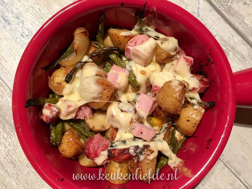 ’s Avonds warm ik een kliekje aardappels, sperziebonen en beenham op in de oven met een plak kaas erover.