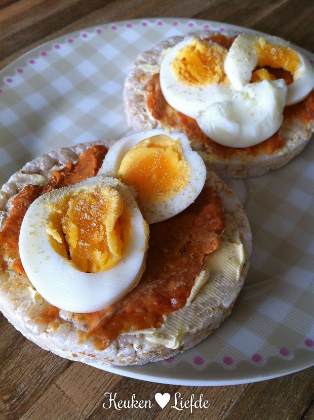 Ik ontbijt met twee rijstwafels met filet american en een gekookt eitje. Lekker!