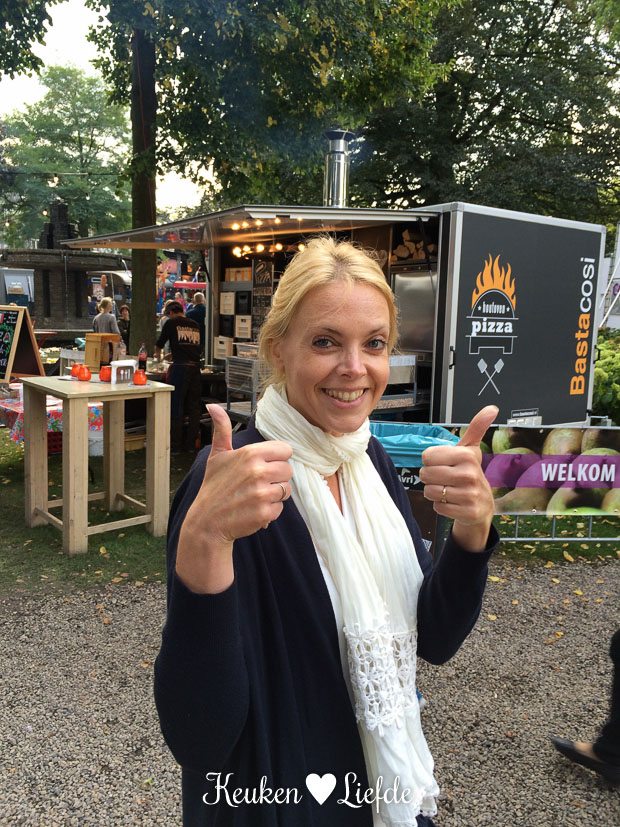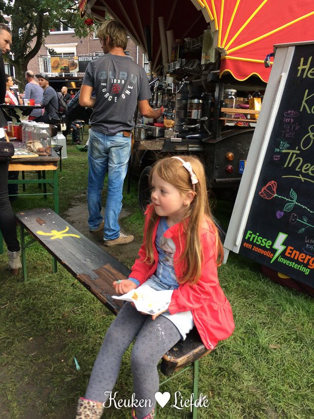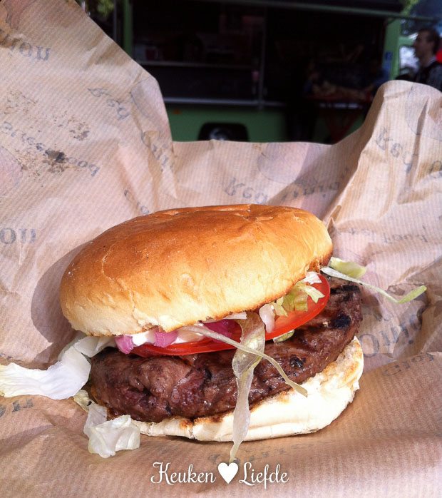 Van al dat gewandel krijg je trek. Gelukkig kunnen we lekker ète, pruven en drinken op het foodtruckfestival Pruuf’t, in het kalverbos. Johan en zijn vader nemen een Angus burger met sla, tomaat, ingemaakte rode ui en vadouvan saus van de Red Onion. Ik proef een hapje. En later nog één en nog één … Potverdikkie, wat is -ie lekker!