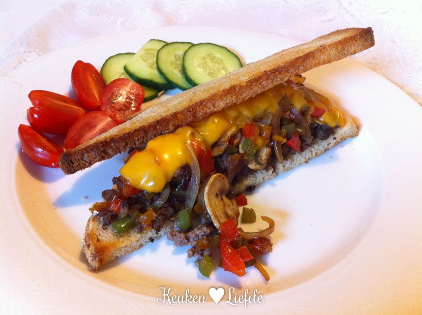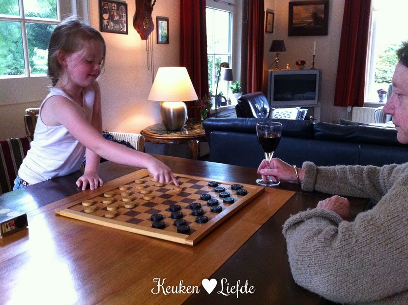 Daarna maak ik ook nog een hele lekkere tosti met gehakt, paprika en champignons. El zit ondertussen met oma een potje te dammen. De tosti eet ik overigens niet zelf op — ik sta nog op klappen van de kibbeling —, maar serveer ik aan gewillige proefkonijnen. 🙂