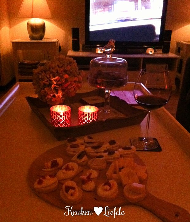 Johan en ik kijken ’s avonds een filmpje met hapjes erbij. Stokbroodje met brie en hardgekookt ei en wat blokjes kaas. We drinken er een lekker glaasje rood bij. Genieten!